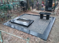 Первым делом на месте захоронения был проведен демонтаж всего, что там было. Сооружен бетонный ленточный фундамент. Уложена гранитная подложка под ограду, подставка под памятник, цветник и лавочка, также все свободное пространство могилы закрыто гранитной брусчаткой. Кстати, изначально лавочка была установлена иначе, чем обсуждалось и ее пришлось переустановить, хотя на могиле именно первый вариант установки был более привлекателен.